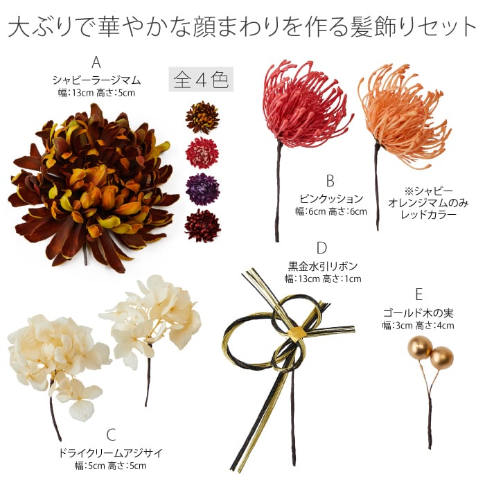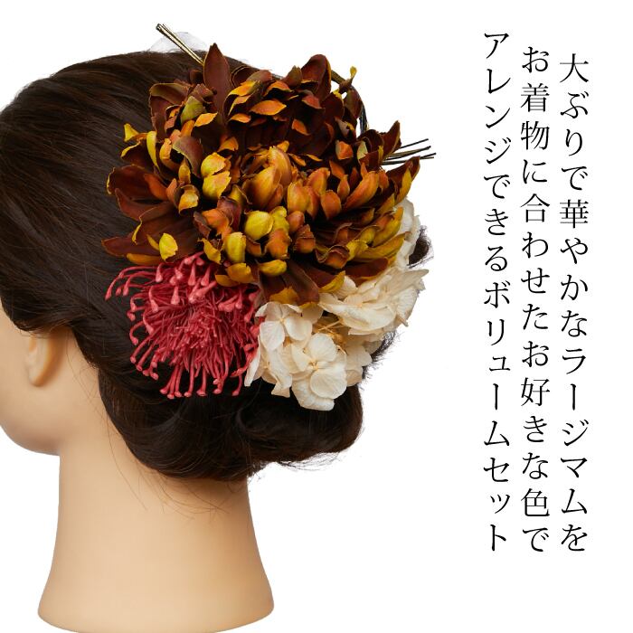 大ぶりで華やかなラージマムをお着物に合わせたお好きな色でアレンジできる、ボリューム感たっぷりの和装髪飾りセット。2色のグラデーションの色合いがシャビーシックでかっこいい雰囲気で飾ってくれます。