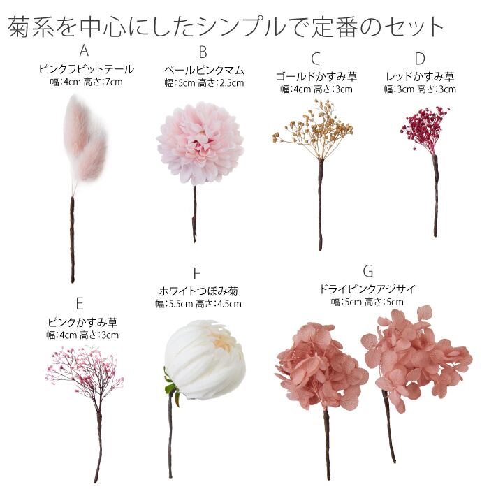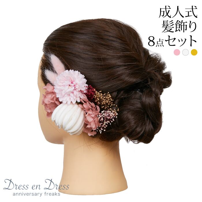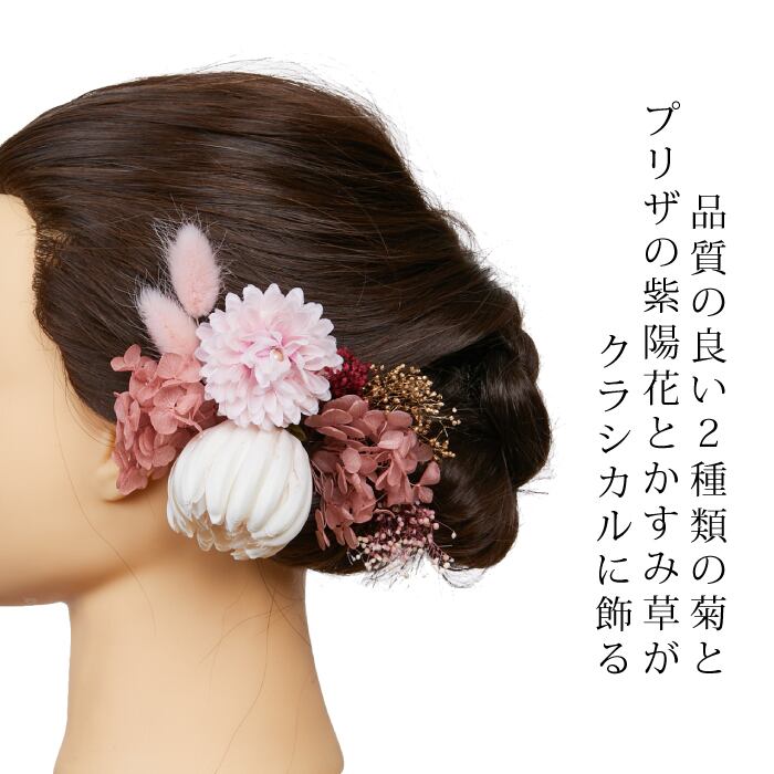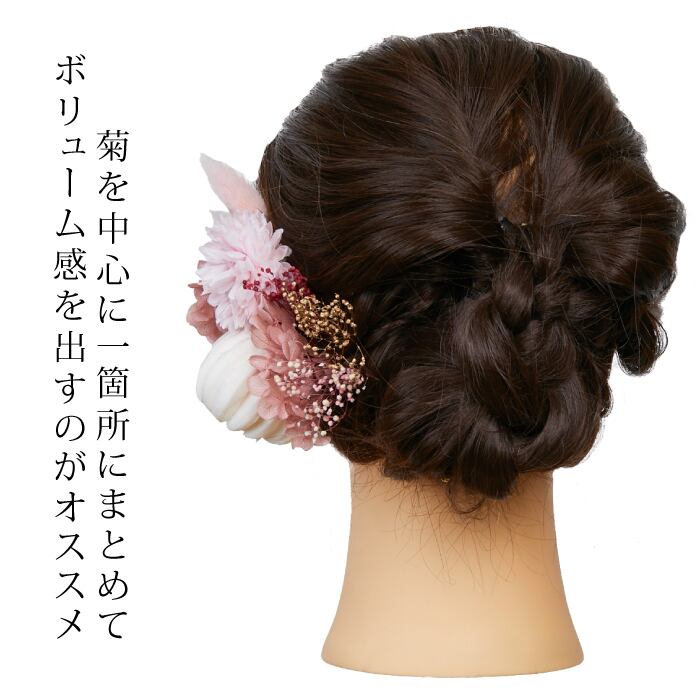 ホワイトのつぼみ菊とピンクのミニ菊が和装にぴったりの髪飾りセット。シュッとしたラビットテールがシャープな印象を作りながら、アジサイ・かすみ草が華やかな印象をプラスしてくれます。